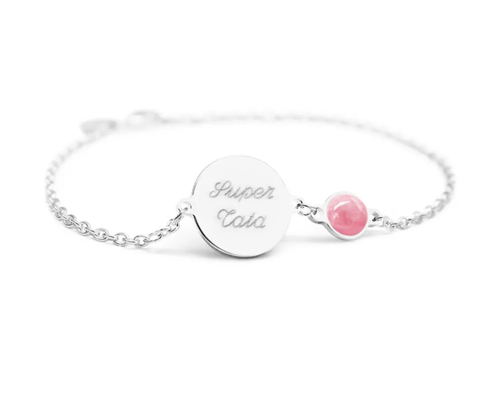 Pour plus de gaité et de chic, nous y avons associé une délicate pierre fine rose en rhodochrosite sertie sur la version argent 925, et une nacre blanche sertie sur la version plaqué or. Personnalisez votre bracelet par une gravure qui a du sens afin de rendre ce bijou unique.