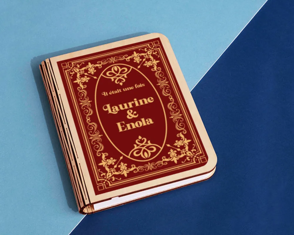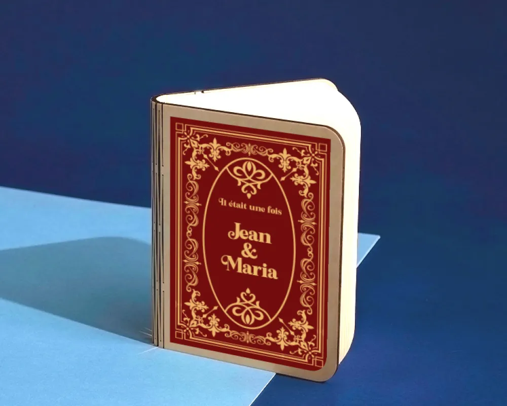 Plongez dans un univers féerique avec notre lampe livre personnalisée ! La couverture, d’un magnifique rouge et or, évoque le charme des contes de fées, et elle peut être ornée des mots « Il était une fois » suivis de deux prénoms de votre choix. Ce livre lumineux personnalisé peut être utilisée comme une veilleuse originale, ajoutant une touche magique à votre espace.