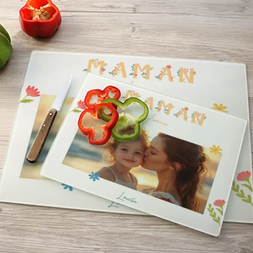 Idéale pour la fête des mères, un anniversaire ou Noël, cette planche à découper personnalisée en verre est parfaite pour célébrer l’amour maternel avec originalité. L’effet masque fleuri sur le mot MAMAN apporte fraîcheur et sensibilité au visuel, pour un rendu aussi touchant qu’élégant.