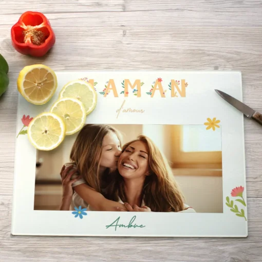 Voici un cadeau de cuisine qui mêle l’utile à l’émotion : la planche à découper en verre personnalisée de la collection Amour Fleuri. Elle transforme chaque moment passé derrière les fourneaux en une déclaration d’amour tendre et poétique. Une photo pleine de douceur, un prénom ou mot d’amour, et un design floral délicat viennent sublimer cette création à forte valeur sentimentale.
