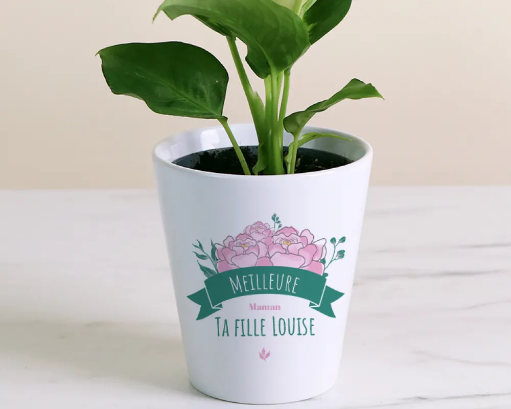 La Fête des mères est l’occasion idéale d’offrir de jolies fleurs ou une belle plante à votre maman. Faîtes une pierre deux coups en accompagnant votre cadeau d’un beau pot de fleurs aux couleurs pastel et personnalisable !