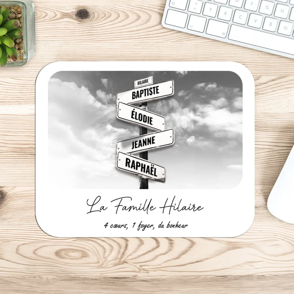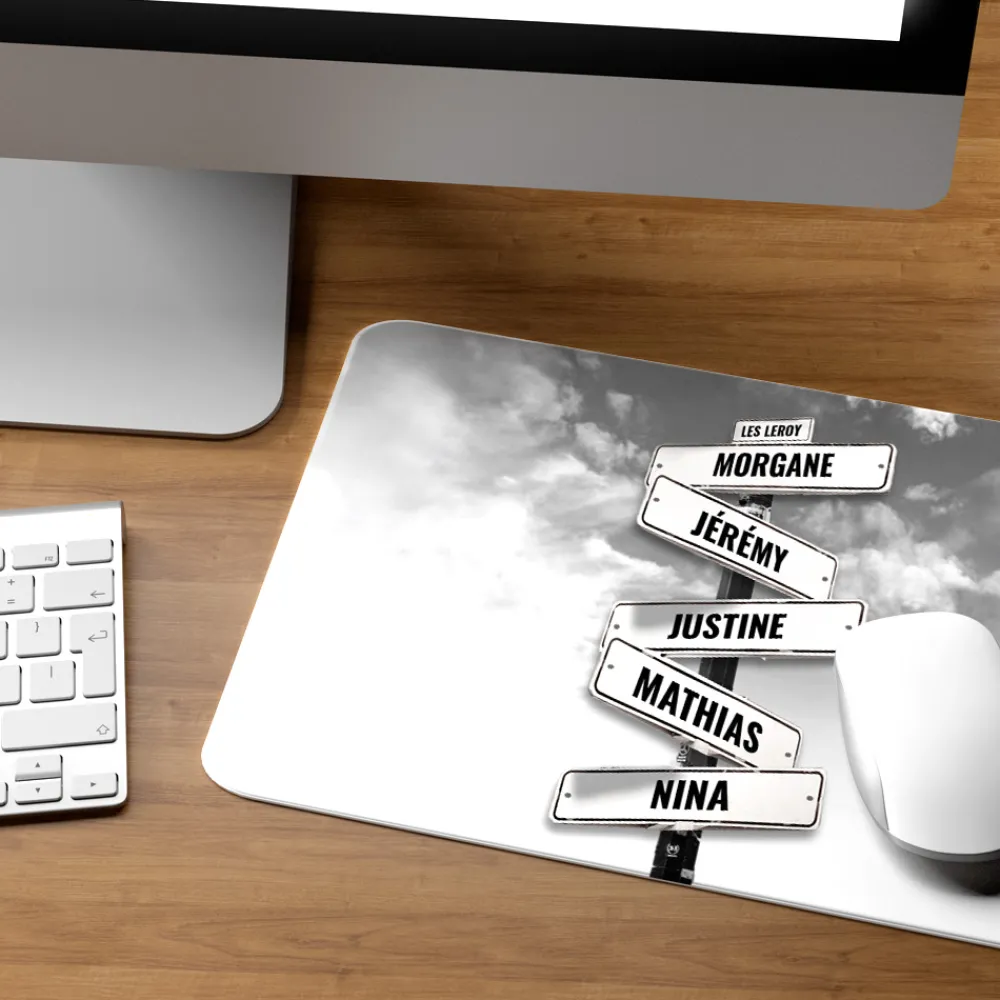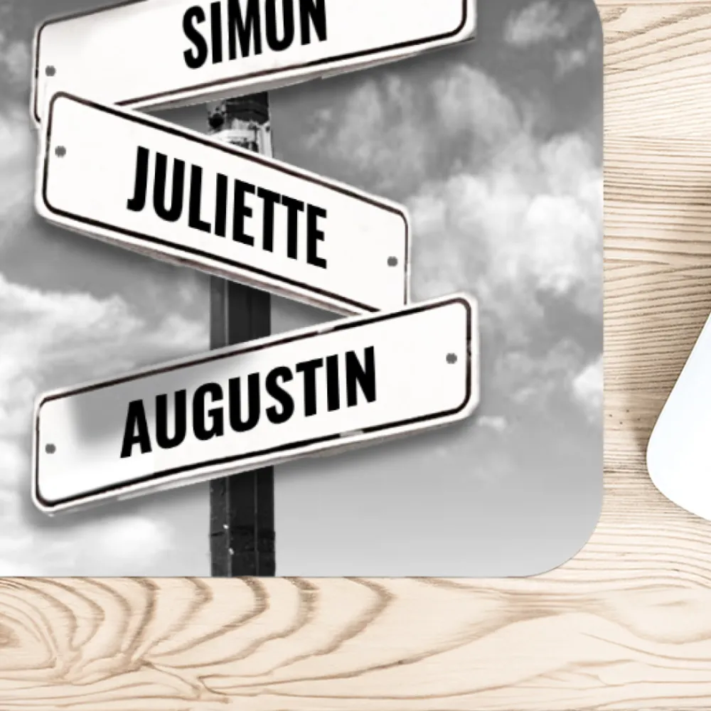 Ajoutez une touche de personnalisation à votre espace de travail avec ce tapis de souris personnalisé inspiré des panneaux directionnels. Chaque panneau peut afficher les prénoms de vos proches, apportant une note chaleureuse et unique à votre bureau. Avec son design original et sa surface douce, ce tapis de souris allie style et praticité pour accompagner vos journées.