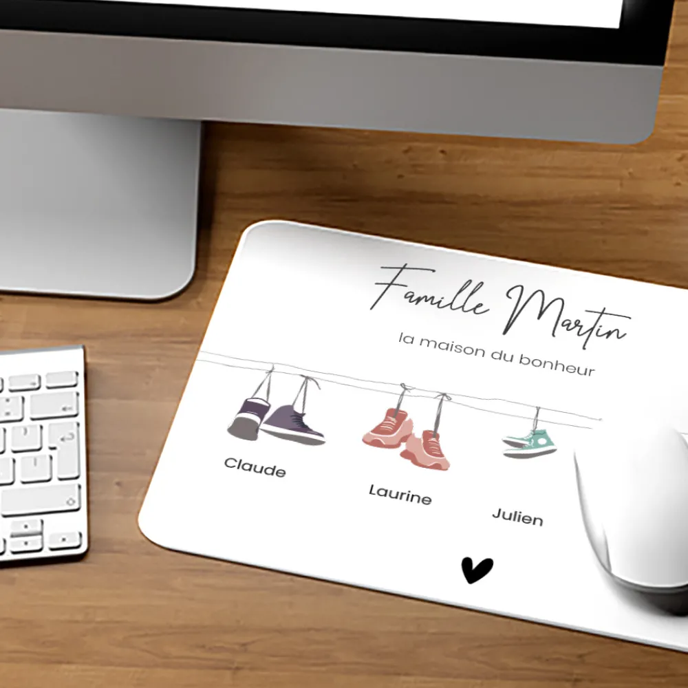 Ce tapis de souris personnalisé célèbre les liens familiaux avec tendresse et créativité grâce à un design unique de chaussures suspendues. Chaque paire représente un membre de la famille, choisie parmi différents modèles doux et stylisés : bottines de papa, baskets de maman, petits chaussons pour les enfants… Vous pouvez personnaliser de 2 à 6 personnages avec des prénoms ou des dates, et ajouter un titre touchant comme un nom de famille ou une phrase inspirante. Une façon poétique d’apporter un peu de douceur à chaque journée de travail.