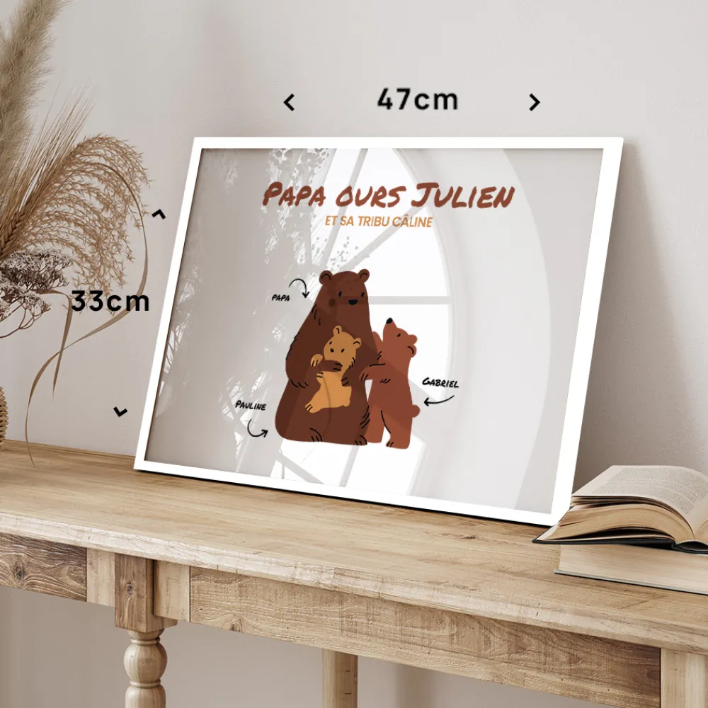 De 1 à 5 oursons peuvent être ajoutés, pour que chaque affiche corresponde à la réalité de votre tribu. Deux lignes de texte personnalisables complètent ce tableau, pour inscrire un doux message ou une date inoubliable. Ce poster personnalisable est un véritable concentré d’émotion qui s’adresse à toutes celles et ceux qui souhaitent faire fondre le cœur d’un papa avec un cadeau unique.