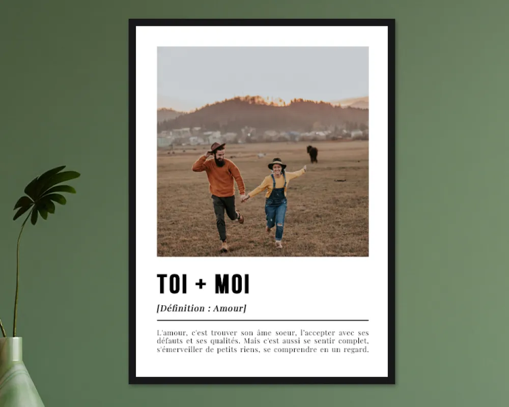 Cette affiche personnalisée avec une photo décrit de manière poétique le lien d’amour qui vous unit. Il ne vous reste plus qu’à renseigner le prénom ou surnom de votre moitié, ainsi que la plus belle photo de vous deux pour le/la surprendre à la St Valentin. Avec son cadre noir sobre et élegant, l’affiche Définition s’integrera avec goût dans une chambre ou un salon pour une touche déco romantique et originale.