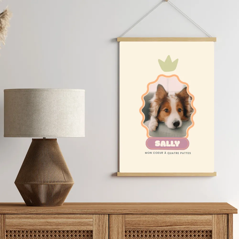 Il suffit parfois d’un regard ou d’un souvenir pour sentir à quel point nos animaux comptent. Cette affiche personnalisée rend hommage à votre fidèle compagnon avec une photo mise en valeur dans un cadre graphique doux et coloré. Son prénom apparaît élégamment dans un cartouche assorti, accompagné d’un petit mot tendre si vous le souhaitez. Un visuel chaleureux, moderne et chargé d’affection, pensé pour tous ceux qui aiment leur animal comme un membre de la famille.