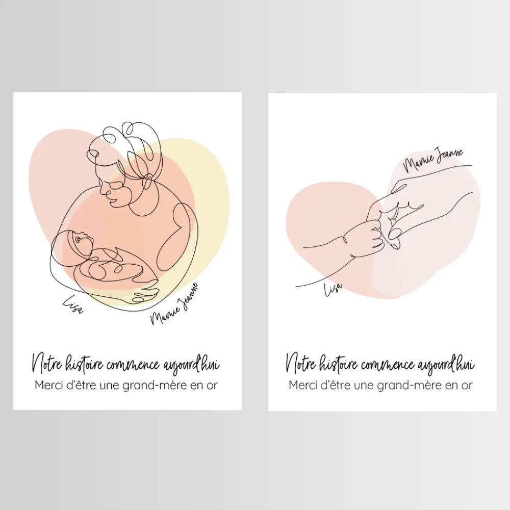Grâce à un design élégant et minimaliste, cette affiche personnalisée pour future grand-mère met en lumière la douceur du lien naissant entre elle et son petit-enfant. Ajoutez les prénoms de la grand-mère et du bébé, un message tendre, et choisissez parmi deux illustrations délicates pour rendre ce cadeau encore plus spécial.