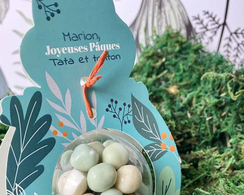 Ce petit lapin de Pâques en carton contient une boule remplie de céréales enrobées de chocolat qui ravira les papilles de tous les gourmands. Et ce n’est pas tout ! Vous pouvez personnaliser l’emballage avec un prénom et un message pour en faire un cadeau unique et personnel.
