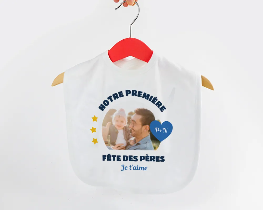 Alors, n’attendez pas plus longtemps ! Laissez votre créativité s’exprimer et créez ce bavoir personnalisé au design moderne et original. Choisissez votre photo préférée, la date clé de cette première fête des pères et un message qui fera fondre le cœur de papa. Offrez-lui un cadeau unique qui lui rappellera combien il est aimé et à quel point il est spécial aux yeux de son bébé.