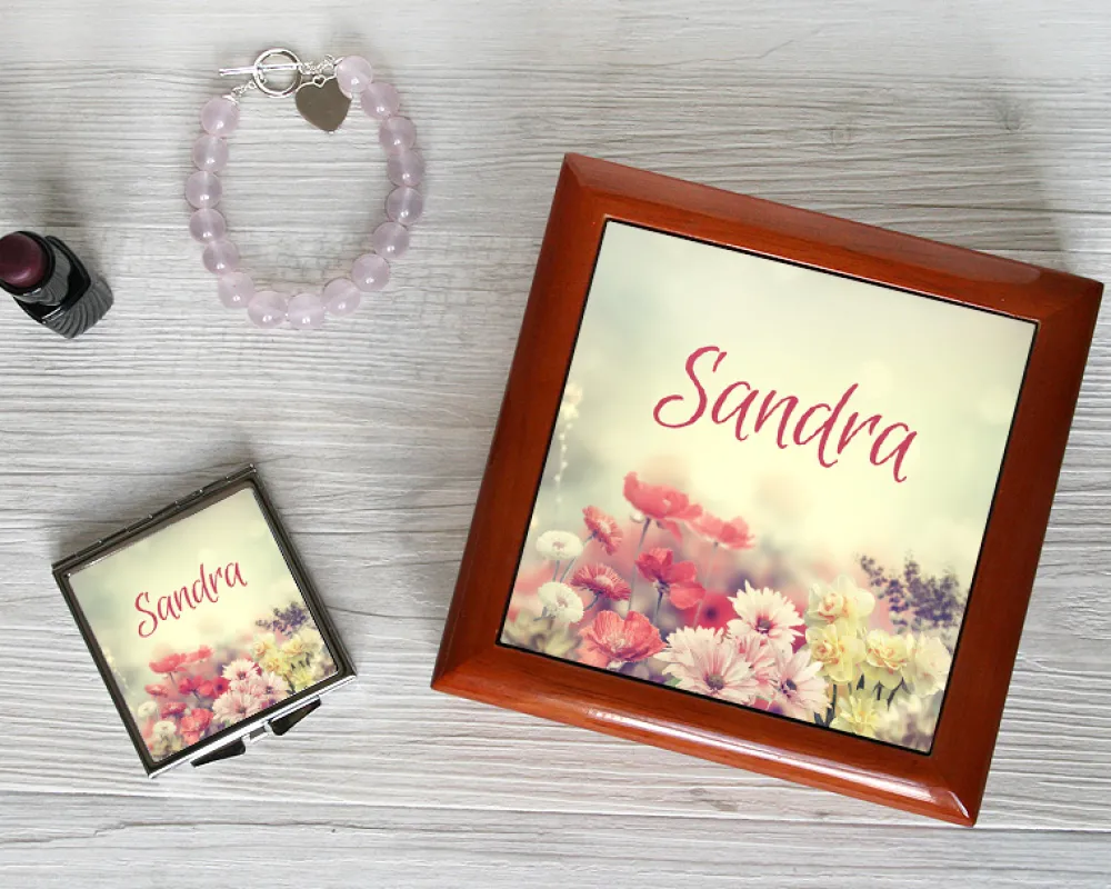 Boite à bijoux et Miroir de sac Fleurs|Cadeaux.com
