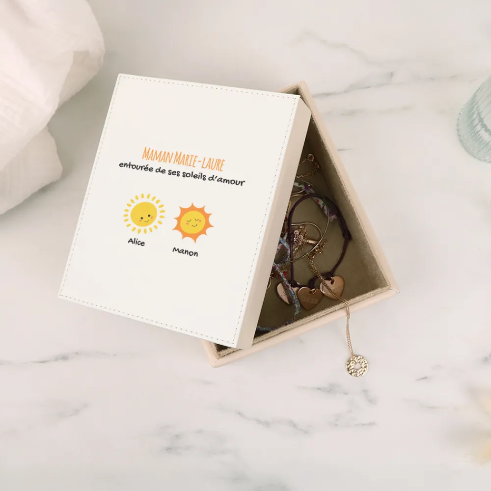 Gardez près de vous vos bijoux et souvenirs les plus précieux avec cette boîte à bijoux personnalisable en cuir, conçue pour célébrer les liens familiaux. Son design élégant de petits soleils, représentant chaque être cher, peut être entièrement personnalisé avec les prénoms de vos proches. Choisissez le nombre de soleils et ajoutez un message sur deux lignes pour un cadeau unique et rempli d’émotion.