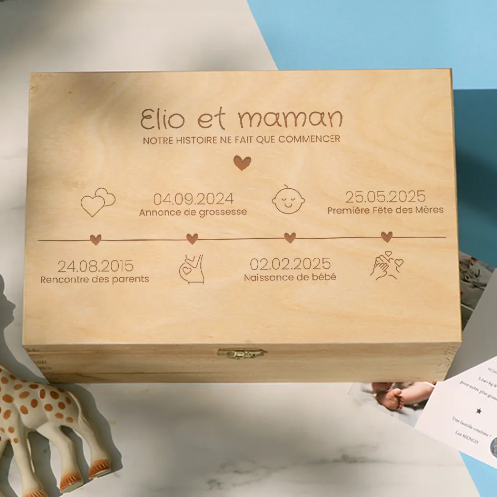 Cette boîte à souvenirs personnalisée capture avec tendresse les premiers instants magiques d’une vie de famille. Son design gravé s’articule autour d’une frise chronologique délicate, retraçant quatre étapes clés : la rencontre des parents, l’annonce de la grossesse, la naissance du bébé et la toute première fête des mères. Chaque date est personnalisable, accompagnée de pictogrammes discrets, d’un titre et d’un sous-titre, pour un souvenir unique et profondément personnel.