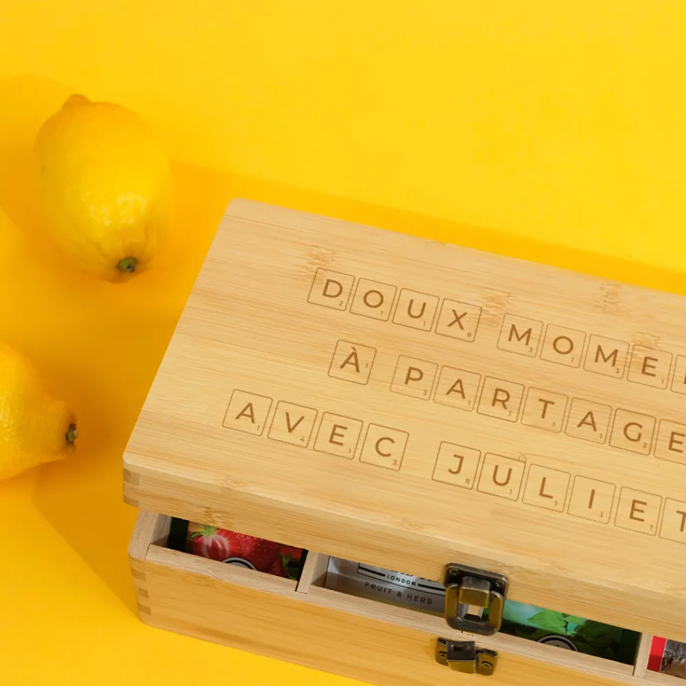 Avec ses lettres gravées façon Scrabble, ce coffret thé personnalisé est bien plus qu’un simple accessoire de dégustation : c’est un message complice et affectueux, à savourer tasse après tasse. Vous pouvez y inscrire jusqu’à deux lignes de texte, composées de mots doux, de prénoms ou d’un clin d’œil personnel, pour un rendu graphique inspiré du célèbre jeu de lettres, à la fois structuré et plein de charme.