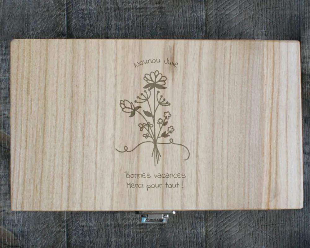 Si la maîtresse de votre enfant, sa nounou ou votre collègue est accro au thé, alors vous détenez le cadeau parfait pour elle ! Pour lui dire merci, inscrivez un petit mot de remerciement à son intention sur cette jolie boîte à thé gravée au motif floral.