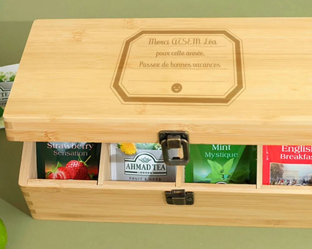 Si la maîtresse de votre enfant est accro au thé, alors vous détenez le cadeau parfait pour elle ! A l’occasion de la fin d’année, inscrivez un petit mot de remerciement pour la maîtresse ou pour la nounou sur cette jolie boîte à thé gravée.