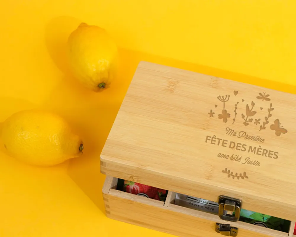 Cette boîte à thé personnalisée en bois est gravée au laser avec toute notre attention dans notre atelier français de Laval.