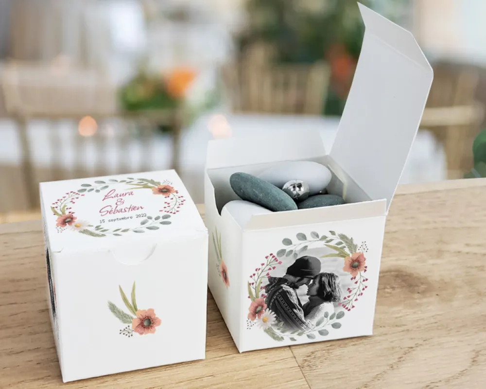 Pour le plus beau jour de votre vie, offrez un cadeau personnalisé pour les invités de votre mariage avec la boîte de dragées personnalisée photo. Cette boîte en forme de cube, ornée de couronnes de fleurs délicates à l’esprit bohème, est le contenant parfait pour présenter vos dragées.
