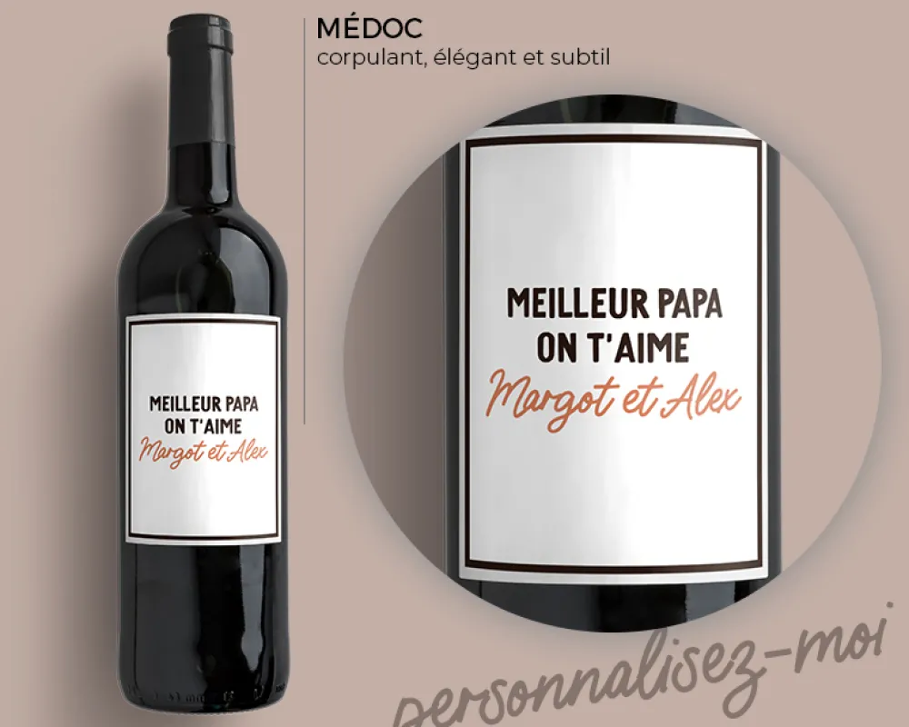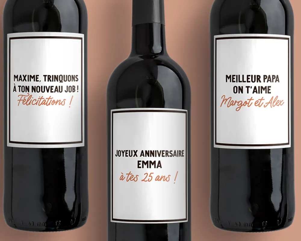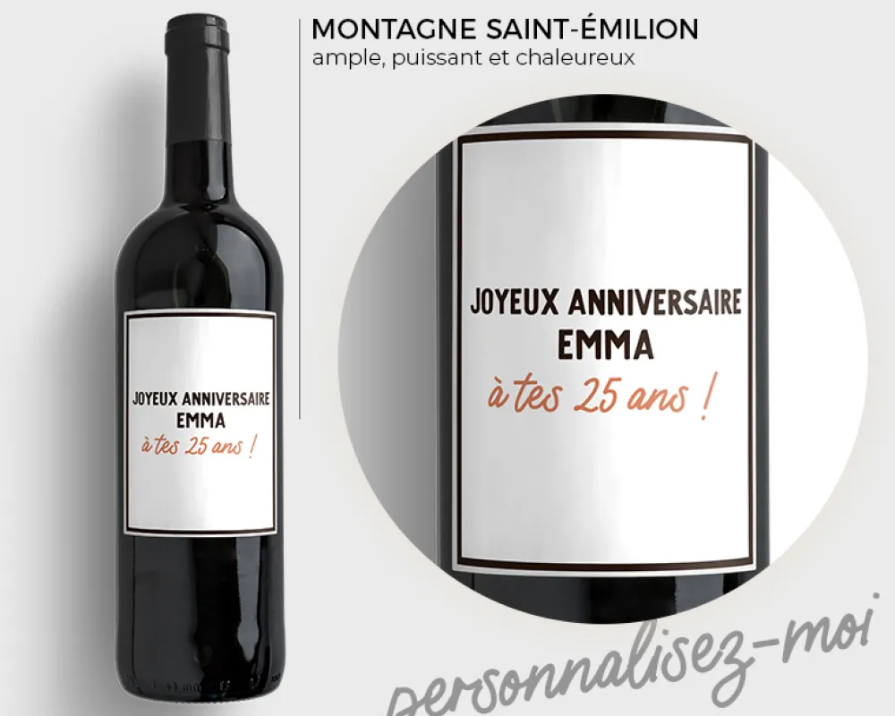 Chaque bouteille est non seulement un délice pour les papilles, mais aussi une œuvre d’art personnalisée avec une étiquette imprimée sur mesure. Offrez une expérience sensorielle inoubliable avec notre bouteille de vin rouge personnalisée, un cadeau qui transcende le simple partage d’une boisson, pour devenir une célébration de la convivialité et de l’art de vivre.