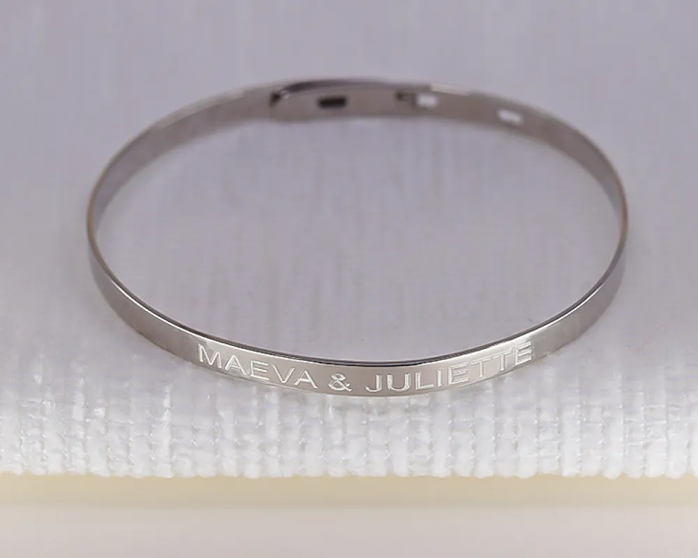Voici le cadeau parfait pour une femme ! Personnalisez ce magnifique bracelet jonc en argent avec un prénom ou un message ! Élégant et chic, il se porte à tous les poignets avec ses 3 crans de fermeture. Offrez-le à l’occasion d’un anniversaire, Noël, la fête des mères ou un mariage, ce cadeau fera plaisir à coup sûr !