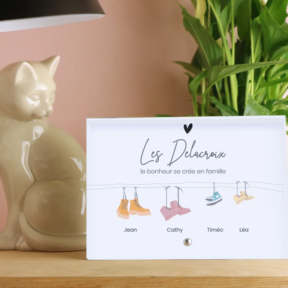 Un souvenir qui se contemple jour après jour. Ce cadre photo en verre personnalisé met en lumière les liens qui unissent les membres d’une famille à travers un design poétique et original. Chaque paire de chaussures représente un parent ou un enfant, illustrée avec douceur et finesse, pour composer une frise touchante allant de 2 à 6 personnes. Sous chaque illustration, ajoutez un prénom ou une date, et complétez l’ensemble par un titre au choix, pour créer une œuvre unique qui parle de votre histoire.