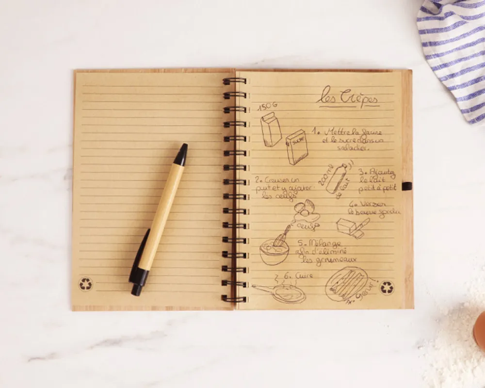 Ce cahier en bambou avec stylo inclut un porte-stylo pratique et un stylo à bille assorti en bambou, avec encre noire. Les 80 feuilles à rayures offrent suffisamment de place pour noter des ingrédients, des astuces ou des anecdotes sur chaque plat. De plus, son design écologique en fait un cadeau aussi élégant que durable.