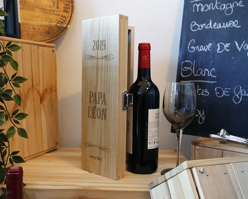 Le temps passe, mais les souvenirs restent. Alors, pour sublimer un événement marquant et le rendre mémorable, gravez-le, non pas dans le marbre, mais dans le bois. Présentez une bonne bouteille de vin, symbole de ce qui se bonifie avec le temps, dans cette jolie caisse à vin en bois gravée avec la date, le prénom du destinataire et un message de dédicace, de félicitation ou des vœux. Avec son look vintage, cette caisse à vin personnalisée témoignera de ce moment particulier, que ce soit une réussite, un anniversaire, une naissance, une union ou un emménagement.