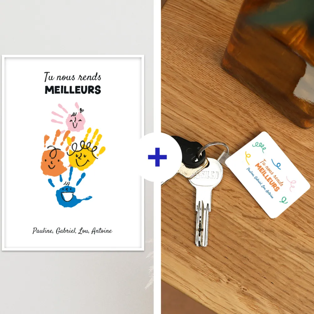 Parfait pour la Fête des Pères, une naissance ou un anniversaire, ce duo d’objets fait naître l’émotion dès l’ouverture. L’affiche, avec ses visages souriants et ses empreintes délicates, devient un souvenir fort à afficher fièrement à la maison. Le porte-clé, quant à lui, l’accompagne au quotidien avec un petit mot plein de sens ou les prénoms de ses enfants. Un clin d’œil discret, mais précieux, à ceux qui comptent le plus.