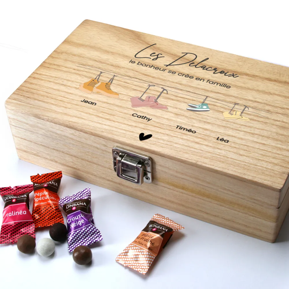 Ce coffret chocolat personnalisé met à l’honneur les liens familiaux avec douceur et originalité. Grâce à son design illustrant les membres d’une famille sous forme de chaussures suspendues, chaque parent et enfant est représenté par une paire stylisée, accompagnée d’un prénom ou d’une date. La composition peut inclure de 2 à 6 personnes, pour créer un tableau gourmand aussi touchant que savoureux. Un titre ou une phrase vient compléter cette boîte unique, parfaite pour marquer un moment fort en émotion.