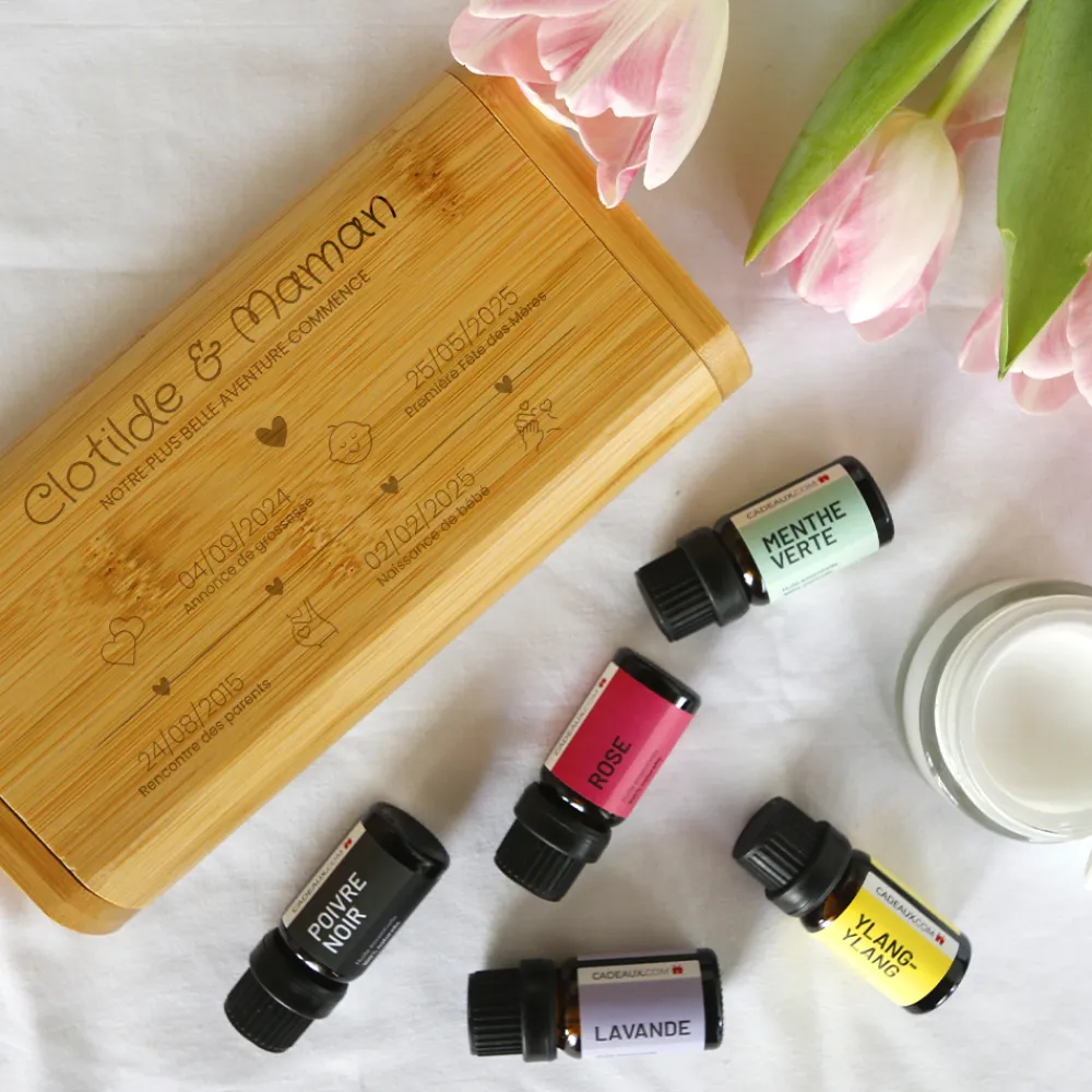 Fabriqué en bambou naturel durable et écoresponsable, ce coffret aromathérapie personnalisé contient cinq flacons de 10 ml d’huiles essentielles aux vertus apaisantes et revitalisantes : rose, lavande, ylang ylang, poivre noir et menthe verte. Parfait pour la diffusion à la maison, il allie soin du corps et soin du cœur dans un seul et même cadeau à la fois utile et symbolique.