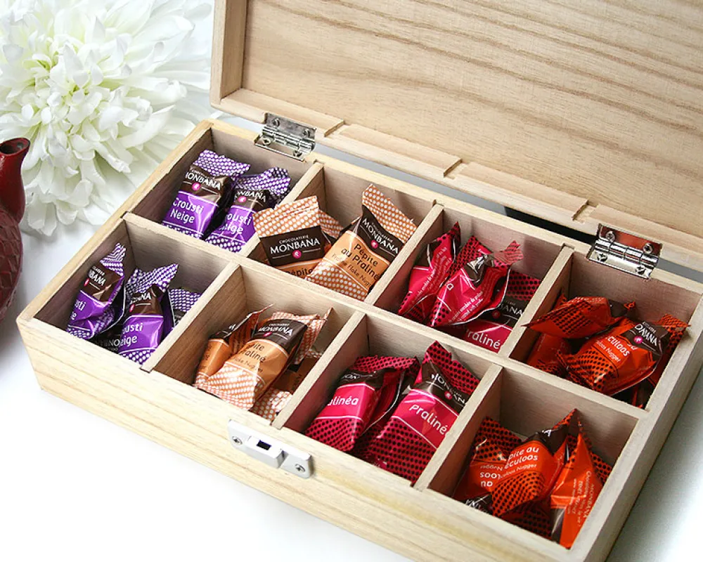 Notre coffret gravé « Prestige » et personnalisé contient au choix un assortiment de 40 ou 80 chocolats répartis dans 8 compartiments. Cette jolie boîte est en bois naturel. Faites-la graver d’un prénom pour étonner un homme ou une femme. Ce cadeau personnalisé et gourmand fera plaisir à tous les adeptes de friandises chocolatées !