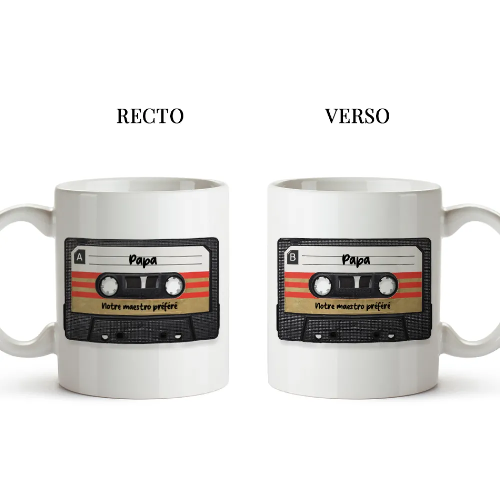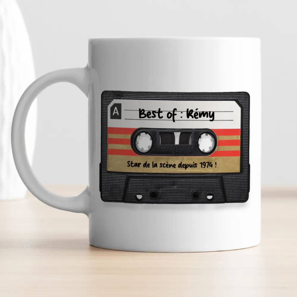 - Un mug personnalisé : L’indispensable de la pause-café ou thé prend une allure vintage avec ce design rétro K7. Pratique et élégant, ce mug est sublimé par votre personnalisation pour un cadeau chargé de souvenirs.