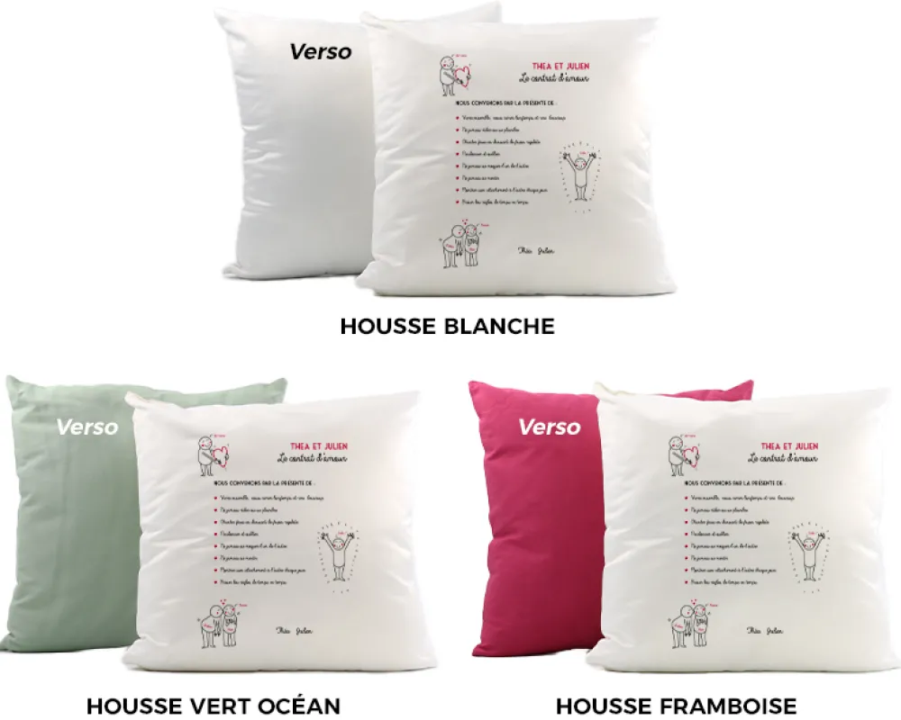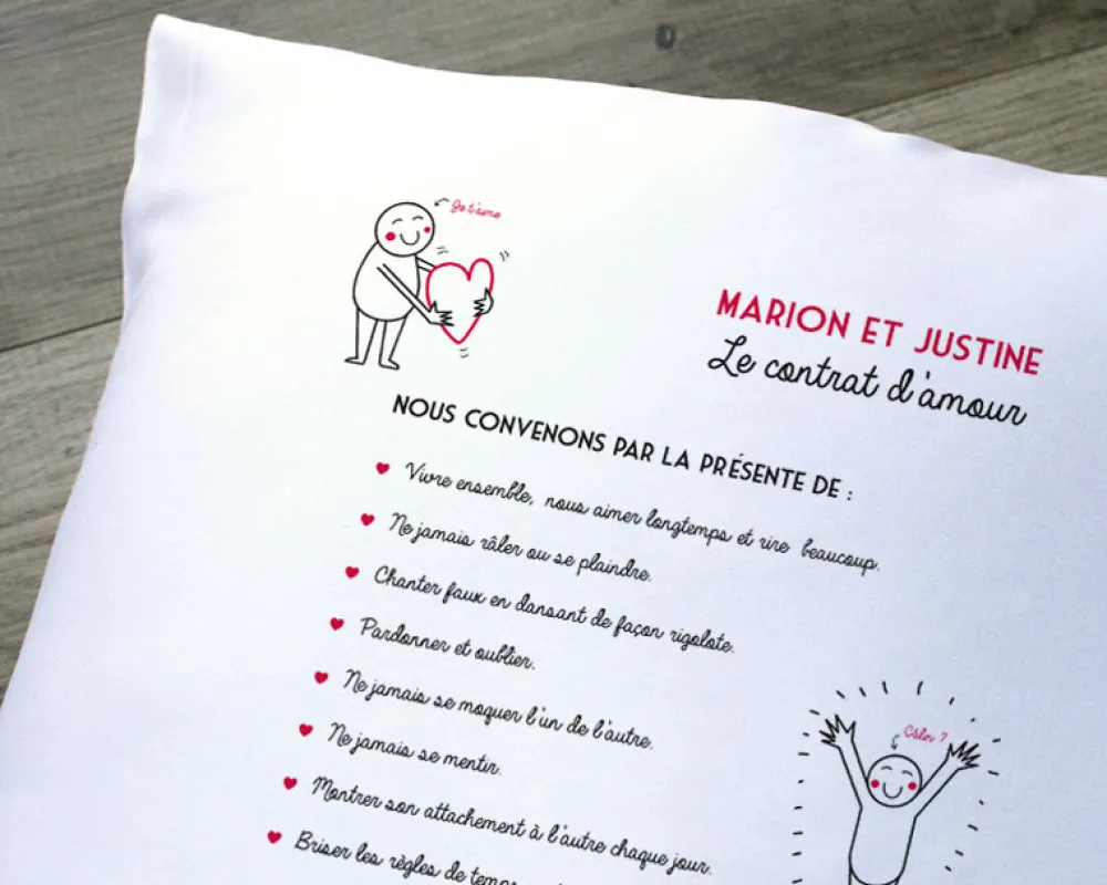 Vous voulez un cadeau insolite mais fun ? Ce coussin contrat d’amour est fait pour vous ! Montrez à votre partenaire à quel point vous l’aimez en personnalisant ce coussin de vos prénoms et de la date de votre choix. Un cadeau original et attendrissant qui réchauffera autant votre intérieur que vos deux coeurs ! Offrez-le à la Saint-Valentin, un anniversaire ou pourquoi pas Noël.