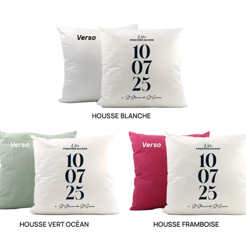 La date s’inscrit fièrement au centre, en trois blocs verticaux sobres et puissants, comme une colonne du souvenir. En haut, un mot ou une phrase vient dire ce que ce jour représente. En bas, un lieu, un prénom, un petit mot doux vient chuchoter le reste de l’histoire. Chaque détail personnalisé fait de ce coussin une pièce unique, chargée d’émotion.