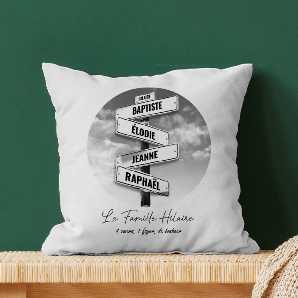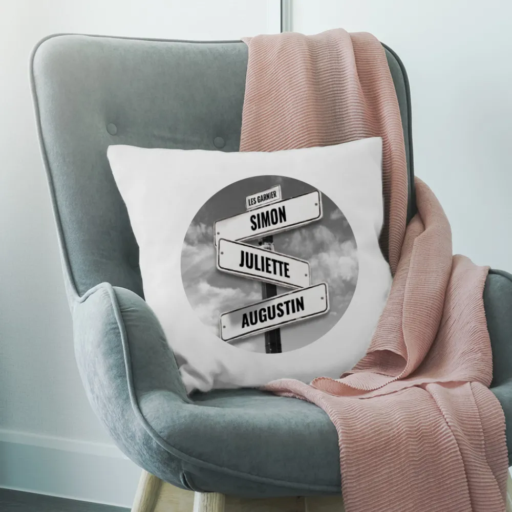Ajoutez une touche douce et personnalisée à votre intérieur avec ce cadeau panneau personnalisé unique en son genre. Inspiré des panneaux directionnels emblématiques de New York, ce coussin célèbre vos liens les plus précieux de manière chaleureuse et élégante.