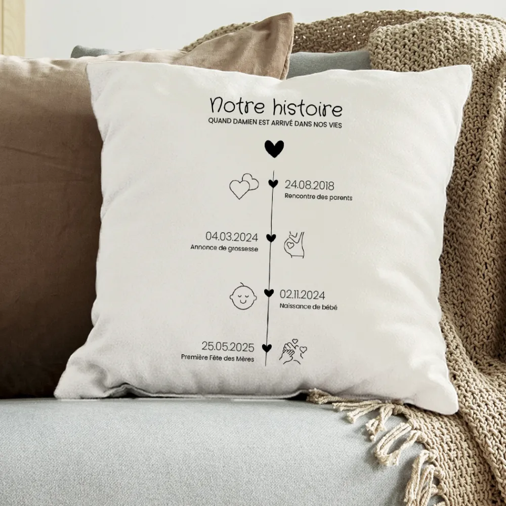 Ce coussin personnalisé met en lumière les plus beaux souvenirs d’une jeune vie de famille à travers une frise chronologique pleine de douceur. Chaque étape essentielle est illustrée avec finesse : la rencontre des parents, l’annonce de la grossesse, la naissance du bébé et la toute première fête des mères. Les dates sont personnalisables, tout comme le titre et le sous-titre, pour une création intime, poétique et chargée d’émotion.