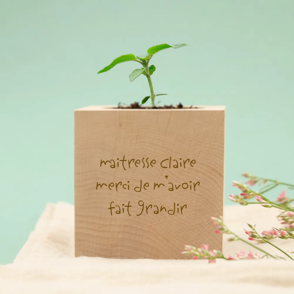 Facile à utiliser, il suffit d’ajouter un peu d’eau et de le poser près d’une fenêtre pour faire naître une jolie plante. Ce cube en bois avec plante personnalisée est un clin d’œil au soin et à la patience qu’une enseignante offre chaque jour. Un cadeau durable et symbolique, parfait pour une fin d’année scolaire pleine de douceur et de reconnaissance.