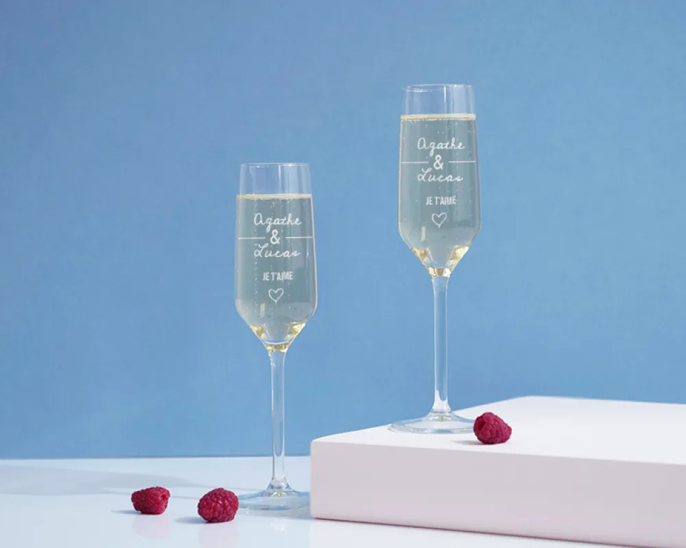 Notes : La gravure des flûtes personnalisées peut varier en fonction du verre. Elle résiste toutefois à un passage au lave-vaisselle.