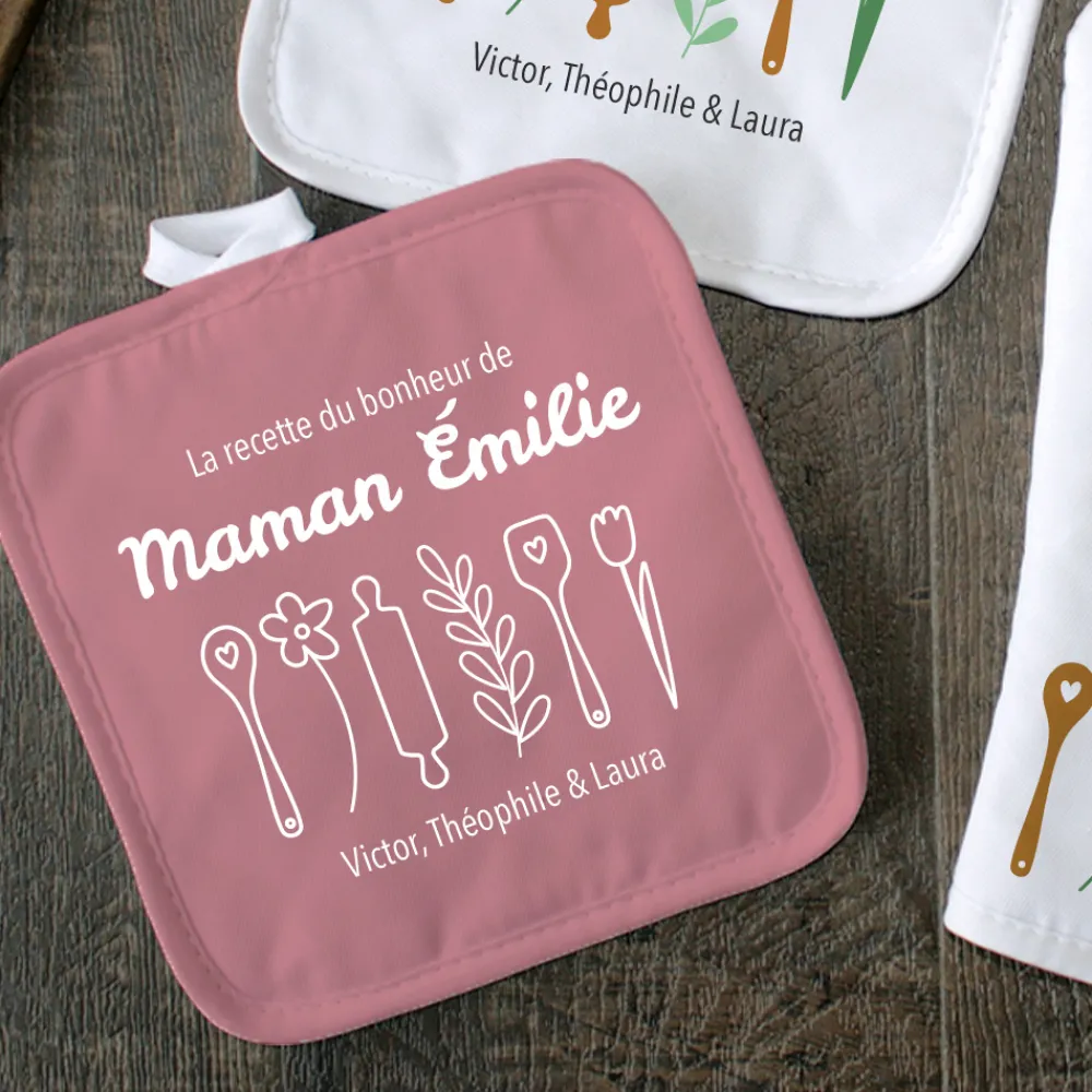 Le gant et les maniques personnalisables de la collection Recette du Bonheur sont bien plus que de simples accessoires de cuisine : ce sont de véritables concentrés d’amour, pensés pour célébrer les mamans qui mettent du cœur dans chaque plat. Pensée pour la Fête des Mères, cette création allie tendresse, utilité et décoration chaleureuse.