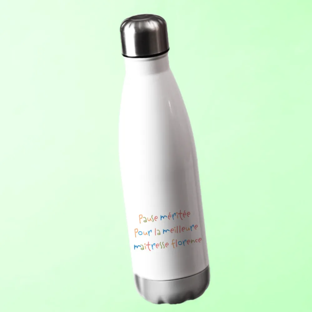 Avec ses couleurs vives et son écriture enfantine, cette gourde personnalisée transmet toute l’émotion d’un mot d’enfant offert avec tendresse. Trois lignes personnalisables permettent d’écrire un petit message drôle, doux ou spontané, comme sur une carte faite maison. Une idée pleine de fraîcheur et d’authenticité pour remercier une maîtresse en fin d’année scolaire, ou simplement lui dire qu’elle compte beaucoup.