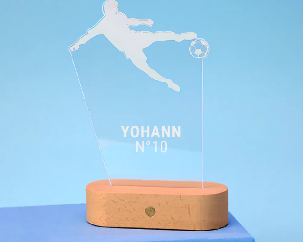 Personnalisée avec soin dans notre atelier de Laval, en France, cette lampe 3D personnalisée incarne la qualité et la créativité. Fournie avec un câble USB, elle se charge facilement. Offrez un cadeau qui éclaire non seulement les espaces, mais aussi les moments spéciaux de la vie de vos proches avec cette lampe foot personnalisée.