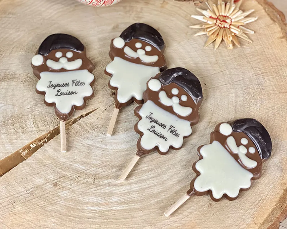 Partagez ces délicieuses sucettes en chocolat au lait en forme de Père Noël pour les fêtes de fin d’année. Vous pourrez personnaliser ces sucettes avec un message ou un prénom. Les gourmands seront ravis de ce cadeau tout mignon.
