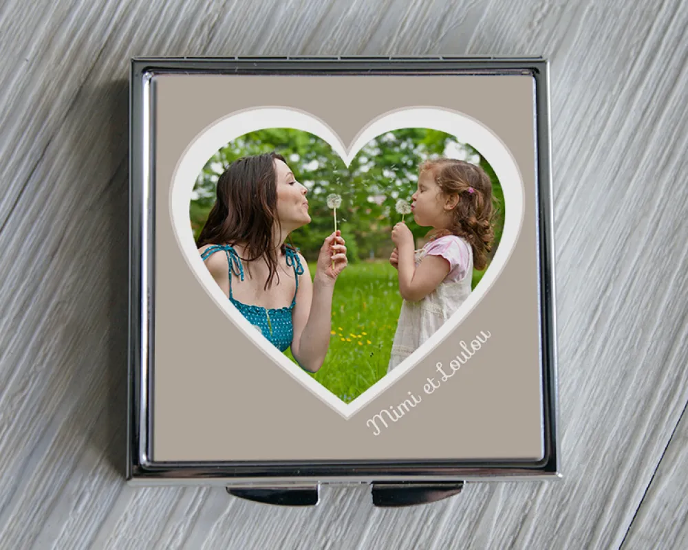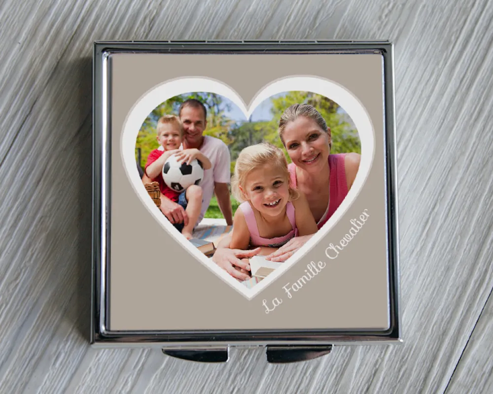 Miroir, Miroir, qui est la plus belle ? Pratique et élégant, ce miroir se glisse facilement dans un sac à main, une poche… à tout moment, il vous dira qui est la plus belle ! Personnalisez-le avec une belle photo dans un coeur. Un cadeau unique et original à offrir pour toutes les occasions !