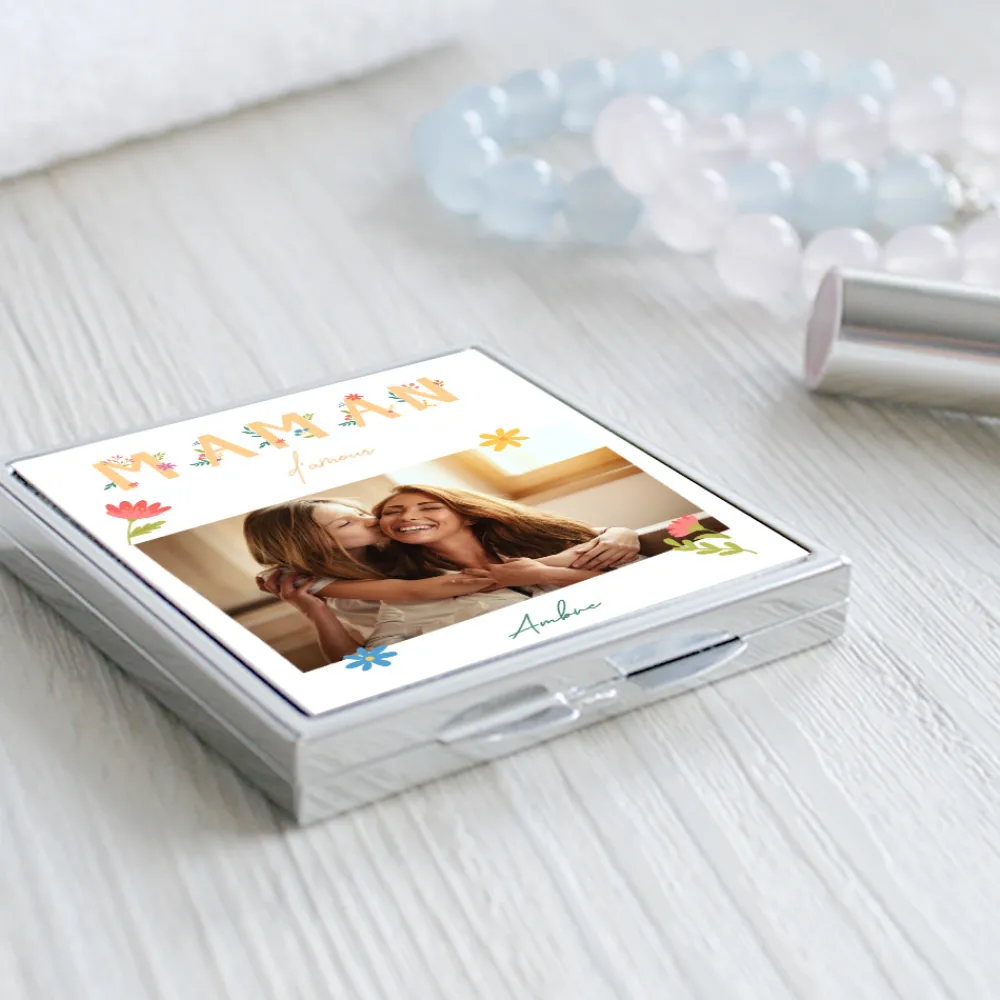 Avec son motif floral en forme de masque sur le mot MAMAN et la possibilité d’ajouter une photo accompagnée d’un prénom ou d’un mot doux, ce miroir compact personnalisé incarne la douceur et la tendresse. Son style graphique épuré et poétique en fait un cadeau parfait pour la fête des mères, un anniversaire ou tout moment chargé d’émotion.
