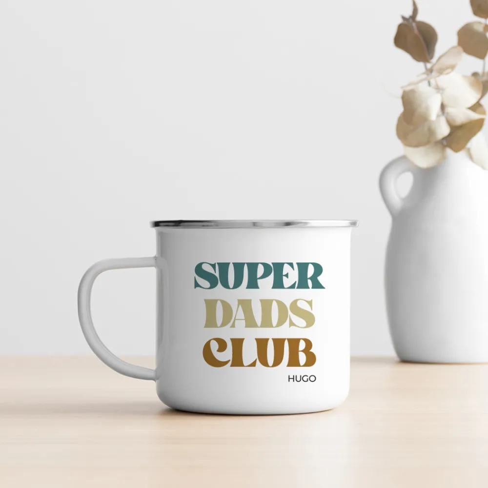 Le mug émaillé personnalisé – Cool Dads Club est la touche parfaite pour célébrer les papas modernes et décontractés. Avec sa typographie audacieuse et ses teintes masculines et douces, ce mug original met en lumière le lien complice entre un père et ses enfants. Le bloc central personnalisable permet d’ajouter un ou plusieurs prénoms ou un message complice, pour créer un clin d’œil à la fois drôle et émouvant.