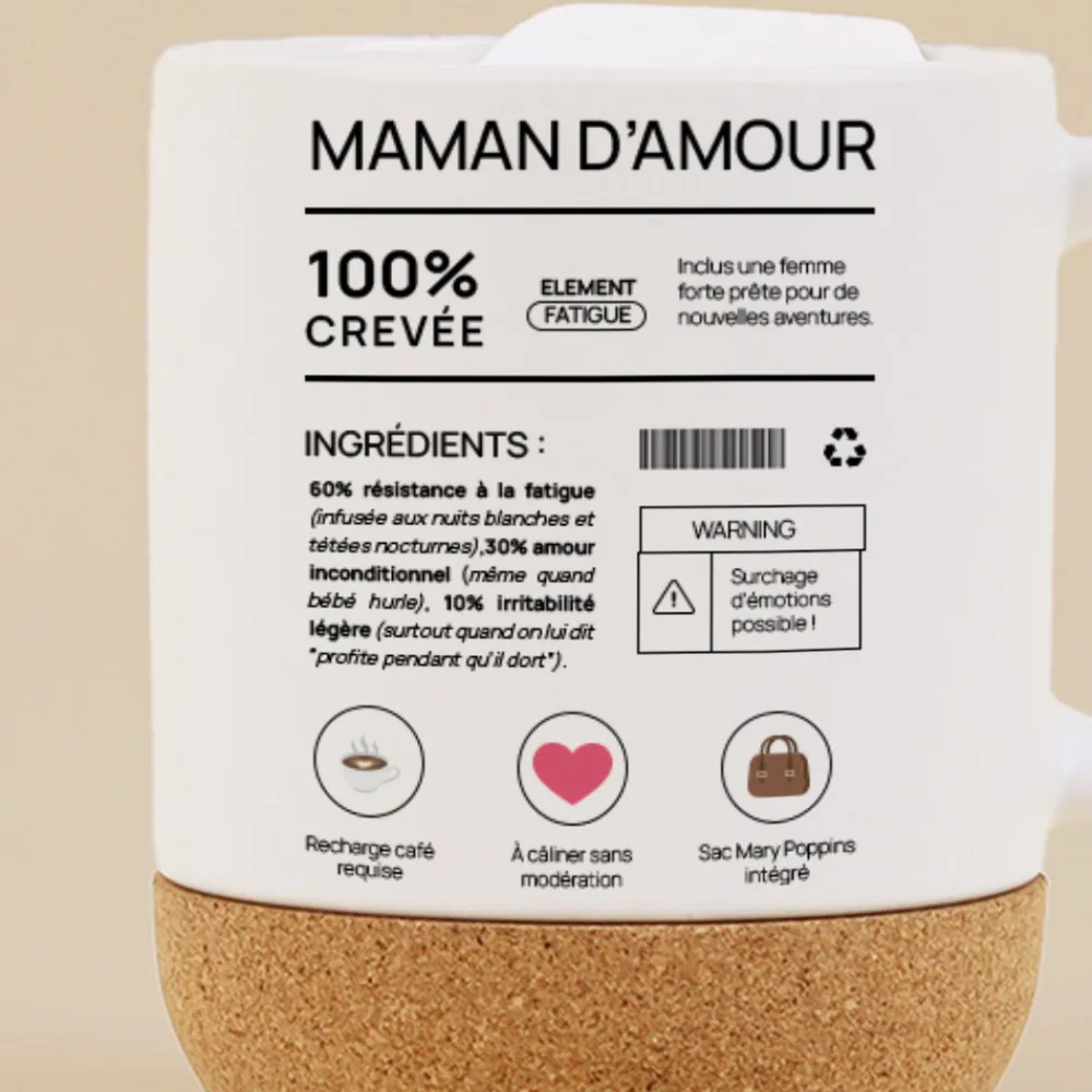Parce qu’être maman, c’est un marathon quotidien mêlé de fatigue, de sourires, de doutes et d’amour inépuisable, ce mug en liège personnalisé est un clin d’œil tendre à celles qui jonglent entre biberons, lessives et câlins. Inspiré des fameuses étiquettes nutritionnelles, son design moderne et humoristique rend hommage à la force tranquille des mamans, en particulier lors de leur première fête des mères.
