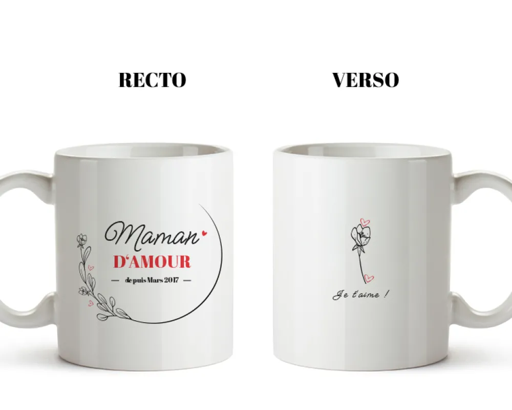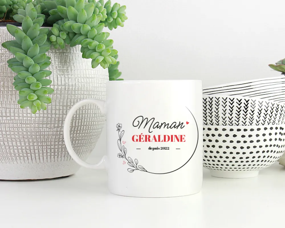 Notre mug personnalisé est joliment décoré avec une illustration florale romantique un brin rétro qui ne manque pas de charme. La qualité d’impression de ce produit permettra à votre personnalisation de résister avec panache au lave-vaisselle et au micro-ondes. Cette tasse personnalisée maman sera le compagnon incontournable des pauses-café quotidiennes.