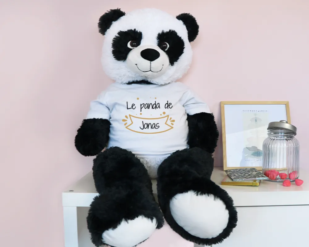 On craque totalement pour ce panda géant en peluche ! Avec son t-shirt personnalisé, il deviendra le meilleur compagnon de son destinataire. Ce dernier, qu’il soit enfant ou adulte, ne résistera pas à autant de douceur. Cette peluche, grâce à la personnalisation en fait un nounours sur mesure vraiment craquant. C’est sûr personne ne voudra le quitter des bras ! Dans le lit pour des câlins ou en déco dans votre intérieur pour vos plus beau clichés lifestyle, c’est sûr il aura à tous les coups une place de choix !