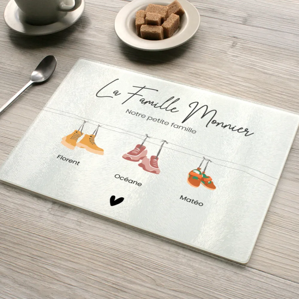 Un moment de cuisine peut aussi devenir un instant rempli d’amour et de souvenirs. Avec cette planche à découper personnalisée, chaque recette s’accompagne d’un sourire. Le design délicat de la collection Ligne Chaussures met en scène les membres de la famille sous forme de petites chaussures suspendues, à personnaliser avec un prénom ou une date. De 2 à 6 personnes, cette création célèbre les liens familiaux avec tendresse et originalité.