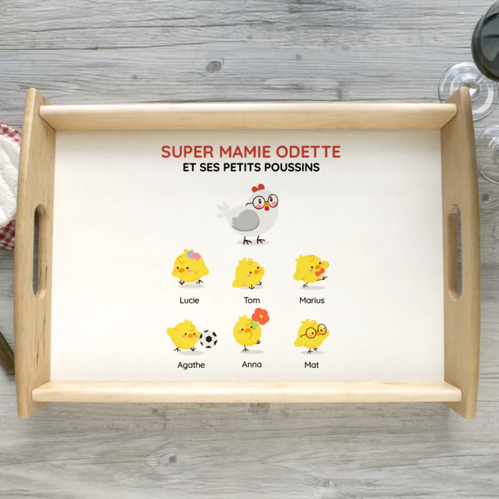 Parce que chaque moment en famille est précieux, ce plateau en bois personnalisé est l’accessoire idéal pour rassembler ceux qu’on aime autour d’un café, d’un brunch ou d’un repas. Son design amusant mettant en scène une maman poule et ses petits poussins, personnalisable avec les prénoms de votre choix, le rend unique et plein de tendresse.
