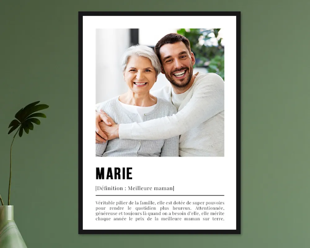 Cette affiche est un cadeau fête des mères personnalisé parfait pour célébrer votre maman à l’occasion de la fête des mères, d’un anniversaire ou simplement pour lui montrer combien elle compte pour vous. Offrez à votre maman une belle déclaration d’amour qu’elle pourra afficher fièrement chez elle ! En choisissant une affiche fête des mères personnalisée, vous êtes sûr(e) de faire plaisir à votre maman et de lui offrir un présent unique et mémorable.